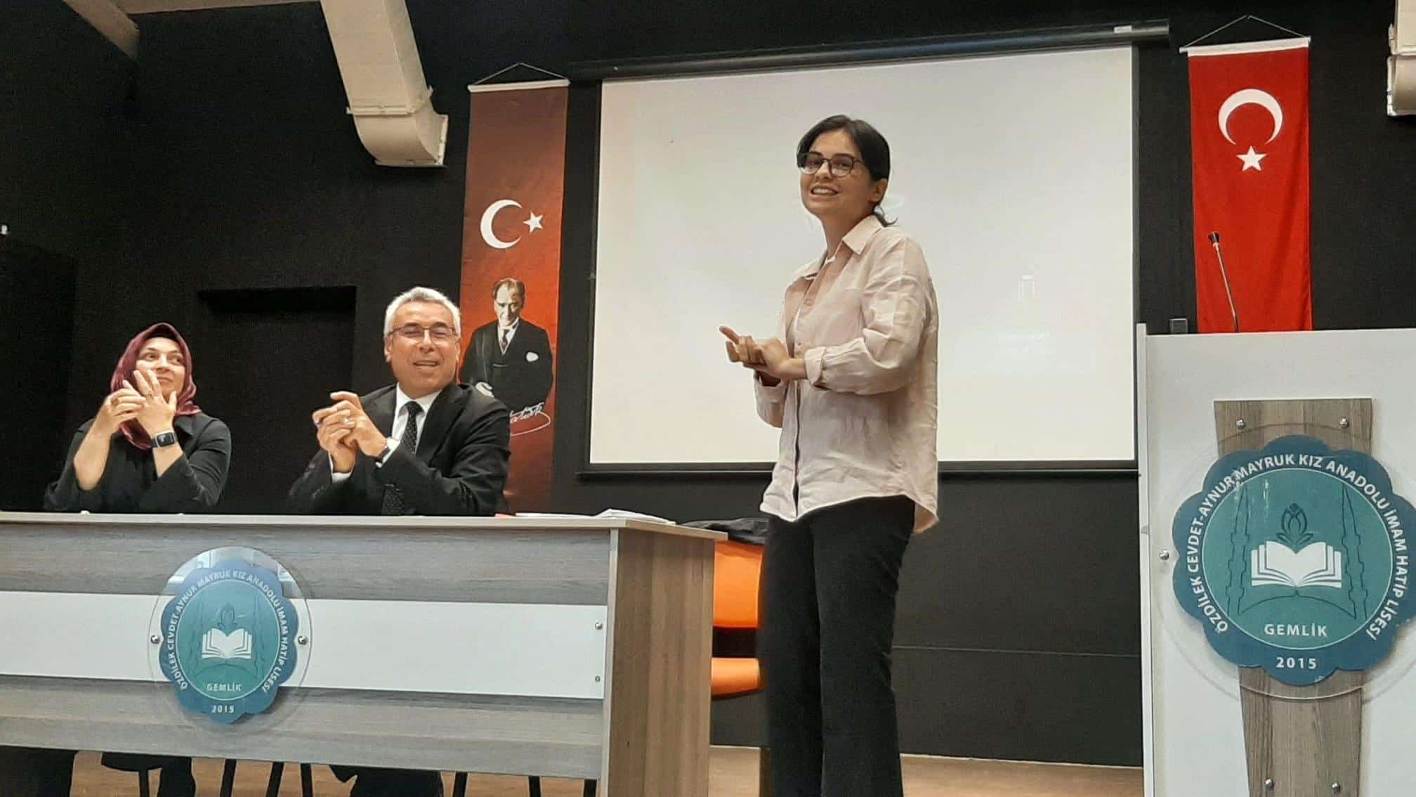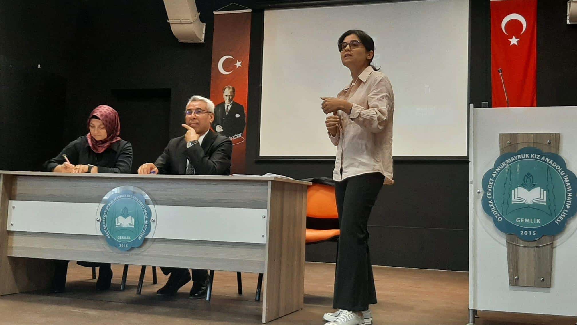 Gemlik İlçe Milli Eğitim Şube Müdürü Muhammet İkinci ve Gemlik RAM Müdürü Ramazan Aydın, Özdilek Cevdet Aynur Mayruk Kız AİHL Okul Müdürü Tevfik Çakır'ın da katıldığı toplantıda Rehberlik ve Psikolojik Danışma Hizmetleri Bölüm Başkanı Esra Kılınç ve Psikolojik Danışman Şeyda Polat yapılacak çalışmalarla ilgili sunum gerçekleştirdiler.